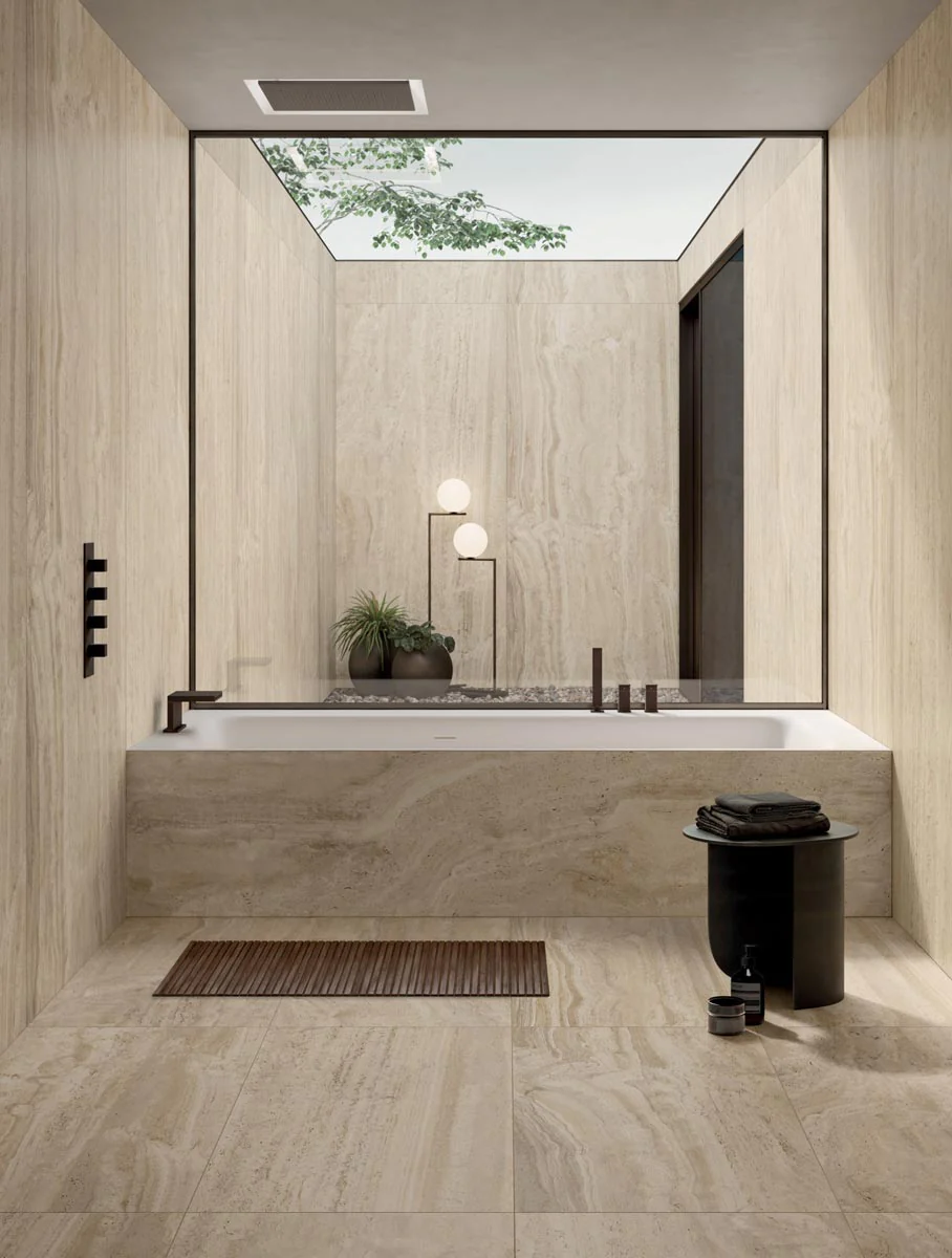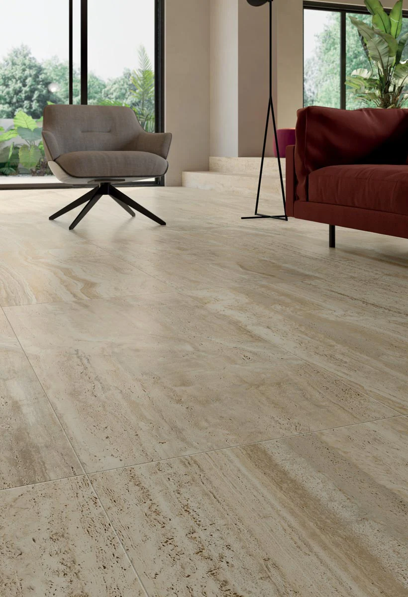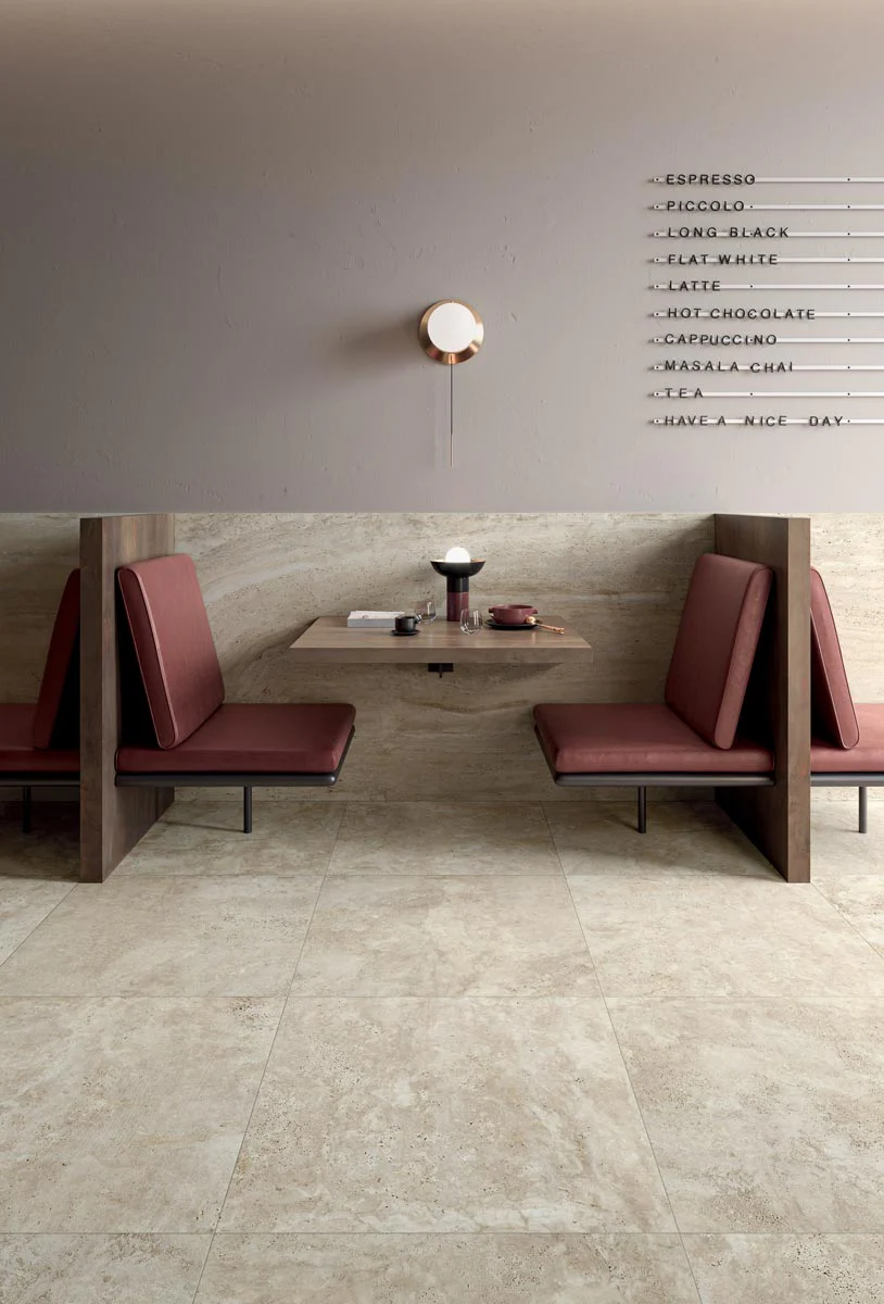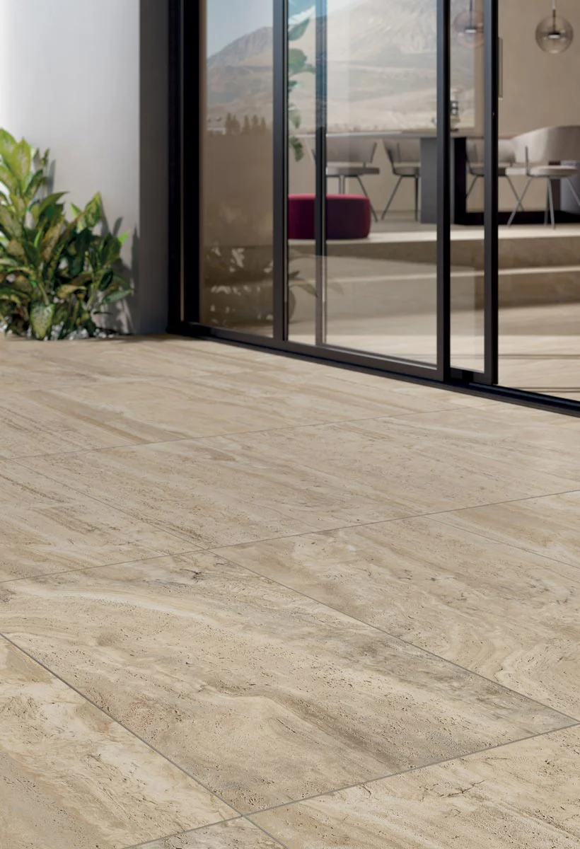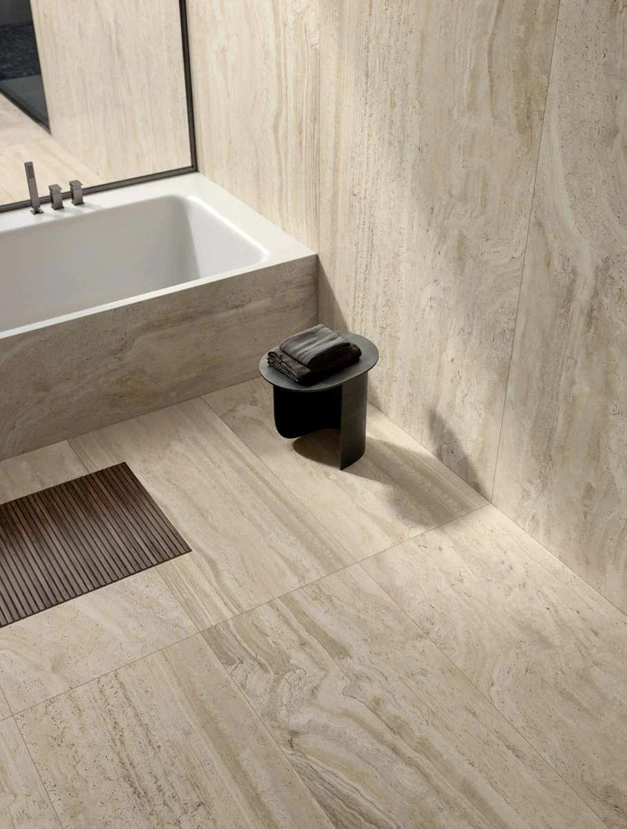 The Navona collection emulates the natural look of unfilled travertine, blending the stone’s timeless beauty with contemporary sizes for both floor and wall applications. This collection stands out for its realistic appearance and offers two graphic versions for each color: vein and cross. Vein cutting highlights layers of calcareous material with visible striations, while crosscutting creates surfaces with light and dark clouded areas, offering the perfect look for any space.