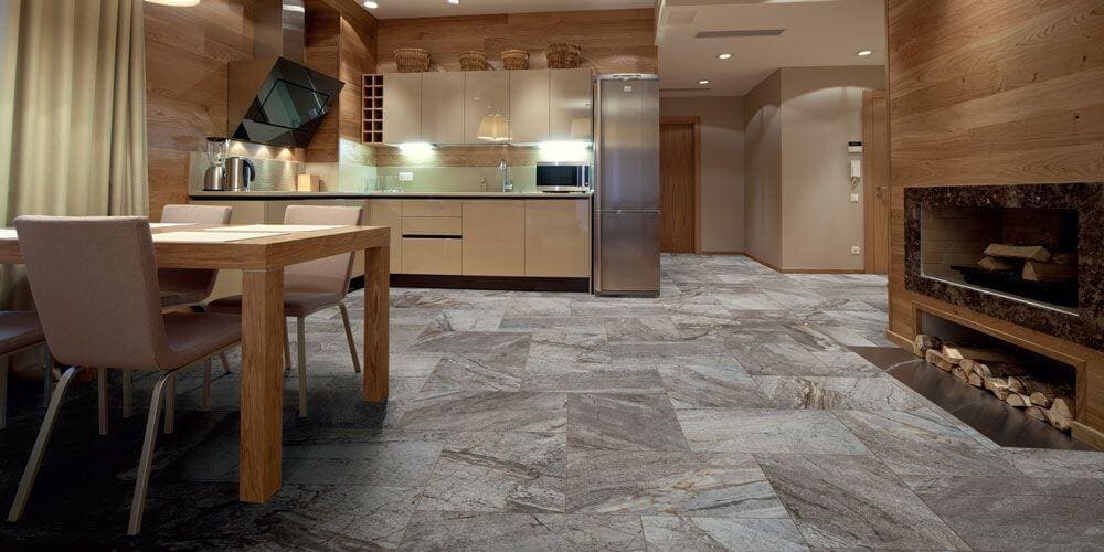 Rectified-edge Italian porcelain tile made of at least 40% recycled content.